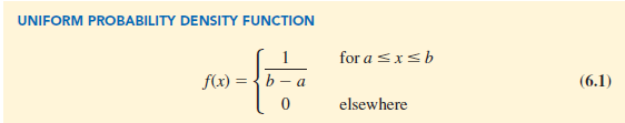 Figure 6.1 is a graph of this probability density function. In general, the uniform probability density function for a random variable x is defined by the following formula.