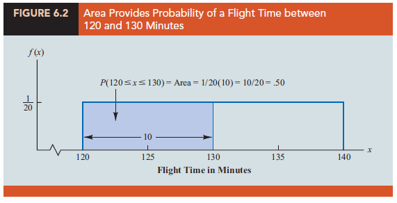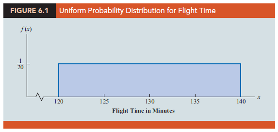 Consider the random variable x representing the flight time of an airplane traveling from Chicago to New York. Suppose the flight time can be any value in the interval from 120 minutes to 140 minutes. Because the random variable x can assume any value in that interval, x is a continuous rather than a discrete random variable. Let us assume that sufficient actual flight data are available to conclude that the probability of a flight time within any 1-minute interval is the same as the probability of a flight time within any other 1-minute interval contained in the larger interval from 120 to 140 minutes. With every 1-minute interval being equally likely, the random variable x is said to have a uniform probability distribution. The probability density function, which defines the uniform distribution for the flight-time random variable, is