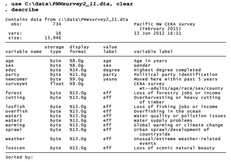 Principal components and factor analysis often help to define new composite variables for further analysis. For example, the factor scores calculated by predict could become independent or dependent variables in subsequent regression analyses. To illustrate this process we turn to the survey dataset PNWsurvey211.dta.