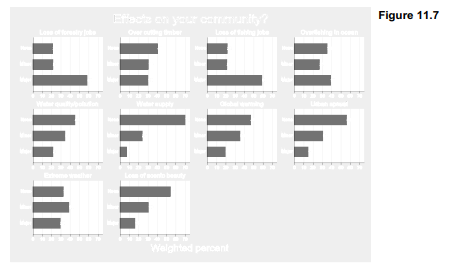Many respondents reported that loss of forestry or fishing jobs had major effects. Water supplies, urban sprawl and loss of scenic beauty were less immediate concerns for their region, as depicted in Figure 11.7. This overview graphic was created by drawing ten simple bar charts using catplot with analytical weights given by the surveywt variable ([aw = surveywt], see Chapter 4), then combining them into a single image with graph combine.