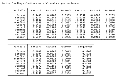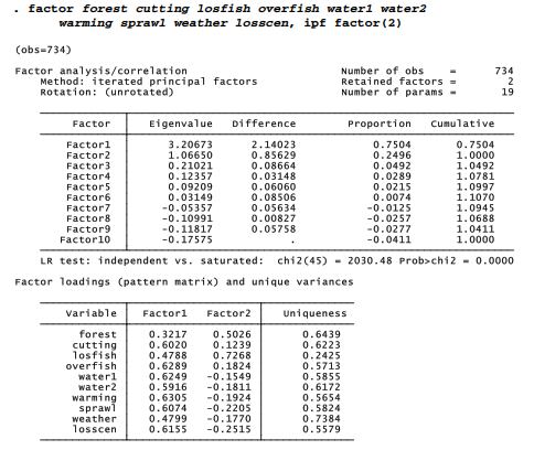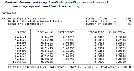 Does concern about these 10 environmental issues reflect a smaller number of underlying dimensions? Principal factoring with iterated communalities (ipf) identifies the underlying dimensions that best account for the pattern of correlations between variables.