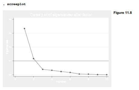 How many factors should we retain? Only the first two have eigenvalues above 1, although with principal factoring (unlike principal components) an eigenvalue-1 cutoff is sometimes viewed as too strict. A scree plot (Figure 11.8), however, visually confirms that after the first two factors, the remainder all have similar, low eigenvalues.