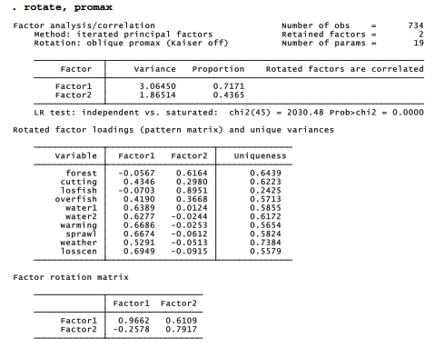 Promax (oblique) rotation simplifies factor patterns while permitting some degree of correlation between the factors. Correlated factors will be statistically less parsimonious, because they have overlapping variance. However, they may be more realistic, if we view these factors as representing basic, not necessarily unrelated dimensions of environmental concern.