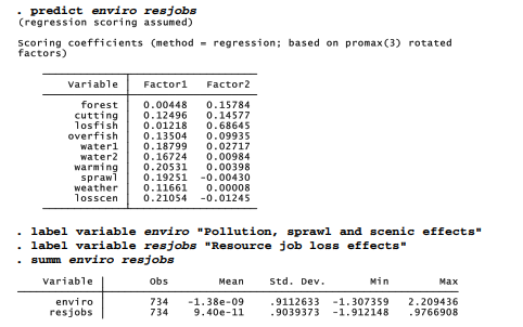 The survey questions about local effects of water quality or supply issues, global warming, extreme weather, urban sprawl and loss of scenic beauty all load much higher on factor 1. Concern about loss of forestry or fishing jobs load much higher on factor 2. Two items that involve both resource overuse and jobs, cutting and overfish, have roughly similar loadings on both factors. Based on these patterns we could interpret factor 1 as representing general environmental concern, and factor 2 as representing resource jobs concern. predict calculates factor scores, which are composite variables defined as sums of the variables’ standardized values, weighted by their factor score coefficients. The two new composite variables are named enviro and resjobs.
