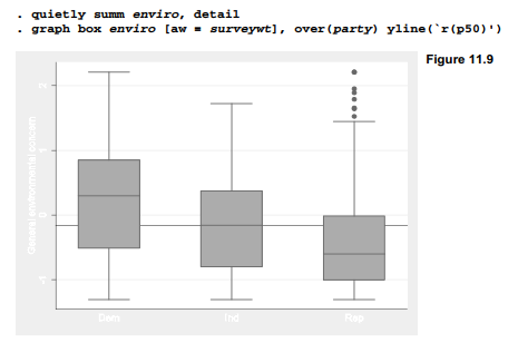Social scientists constructing new composite variables look for evidence of their validity, or relation to what we think they measure. In this example one type of validity, face validity, is supported by the interpretable pattern of factor loadings. A second type, criterion validity, can be explored by testing whether the new variables correlate with other variables as theory or previous research predicts they should. For example, the single most robust finding from recent survey research on environmental concern in the U.S. has been the prevalence of ideological or political party-line effects. Box plots showing the distribution of scores on our general environmental-concern factor (enviro) over respondents’ political party clearly follow this expected pattern. A horizontal line in Figure 11.7 marks the overall median, taken from result r(p50) of a summarize, detail command with survey sampling weights used as analytical weights. Among respondents who identify themselves as Republican, those with high enviro scores appear as outliers.