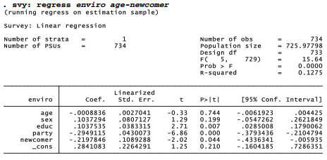 Other common findings reported by previous studies include effects from age, gender and education. The CERA researchers also had an interest in whether the environmental perceptions of rural-area newcomers differ from those of long-term residents. The regression below finds significant education, party and newcomer effects. Respondents who have more education, are Democrats or Independents, and have lived in this region for more than 5 years more often perceive local impacts from these environmental problems.