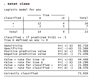 After fitting a model, we can obtain a classification table and related statistics by typing . estat class