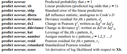 After logistic or logit, the postestimation command predict calculates various prediction and diagnostic statistics. Explanations for logit model diagnostic statistics can be found in Hosmer and Lemeshow (2000).