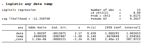 According to the fitted model, each 1-degree increase in joint temperature multiplies the odds of booster joint damage by .84. In other words, each 1-degree warming reduces the odds of damage by about 16%. Although this effect seems strong enough to cause concern, the asymptotic z test says that it is not statistically significant (z = -1.476, p = .140). A more definitive test, however, employs the likelihood-ratio /2. The lrtest command compares nested models estimated by maximum likelihood. First, estimate a full model containing all variables of interest, as done above with the logistic any date temp command. Next, type an estimates store command, giving a name (such as full) to identify this first model: