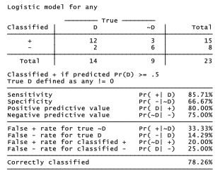 By default, estat class employs a probability of .5 as its cutoff (although we can change this by adding a cutoff( ) option). Symbols in the classification table have the following meanings: