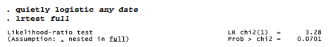 Now estimate a reduced model, including only a subset of the x variables from the full model. (Such reduced models are said to be “nested.”) Finally, a command such as lrtest full requests a test of the nested model against the previously stored full model. For example (using the quietly prefix, because we already saw this output once),
