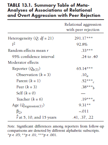 Table 13.1 illustrates one of many ways (and not the only way) you might organize a summary table. Here, I summarize results for the ongoing example meta-analysis used throughout this book involving associations between relational aggression and peer rejection. The first two rows display results of the heterogeneity test and its significance (denoted by asterisks) and the I2 index to quantify the magnitude of heterogeneity. The next two rows display the random-effects mean effect size (with significance level) and confidence intervals around these means. The remaining rows display the results of two moderator analyses: the categorical moderator “reporter” and the continuous moderator age. After reporting the omnibus test (Qbetween) of the categorical moderator, I report the mean associations within each group (type of reporter),3 denoting significant differences between groups with alphabetic subscripts. For the continuous moderator variable (age), I report its signifi-cance (Qregression), followed by the unstandardized regression coefficient and predicted correlations at various meaningful values of the moderator. This table could be expanded in various ways, such as by including additional rows to report the results of more moderator analyses (including comparisons of published vs. unpublished studies to evaluate publication bias), or by adding additional columns to report the results of other meta-analyses (e.g., Card et al., 2008, also reported results involving associations of overt forms of aggression with peer rejection, as well as associations of relational aggression with various other aspects of adjustment).