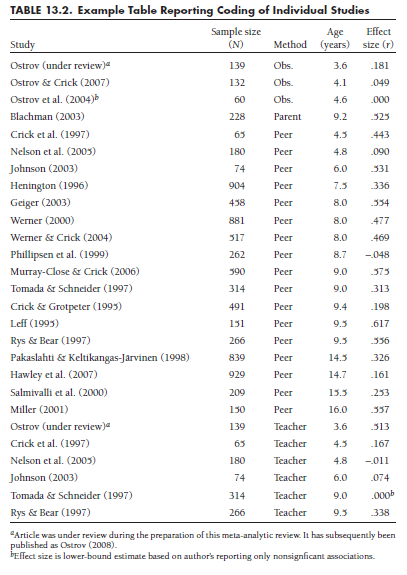 To illustrate this sort of table, Table 13.2 presents coded details of the studies used in the meta-analysis on relational aggression and peer rejection. Here, I have organized studies first by reporter (one of the moderator variables) and then by age (another moderator variable). You can see that this table contains a row for each study,4 columns for each study characteristic coded, and the coded effect size.