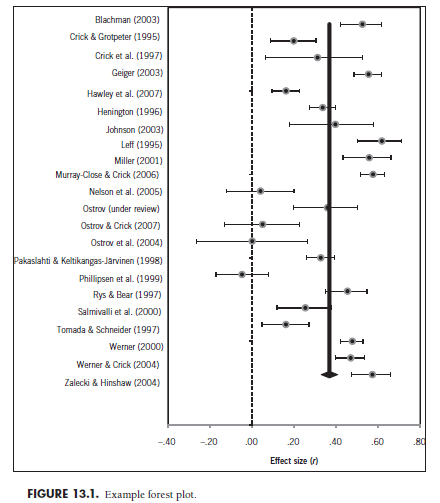 The basic forest plot such as the one I have shown in Figure 13.1 can be extended in several ways (see Borman & Grigg, 2009). For instance, the studies could be ordered in some meaningful way rather than alphabetically, such as by a key study characteristic (i.e., moderator). If order is by a categorical moderator, then you might consider adding multiple vertical lines to denote different mean values within moderator groups. The sizes of the circles for study effect sizes could be larger or smaller to denote, for instance, their relative weighting. It would also be possible to change the shapes or other characteristics (e.g., color, if presenting in color) of these study-specific effect sizes to indicate other features, such as values on a second moderator of interest. Finally, you might consider merging the information of a table of individual studies (e.g., sample sizes, coded scores on various moderators) and the forest plot by creating a hybrid table and figure. This would display a tremendous amount of information, though it might be rather large if you have a large (in terms of numbers of studies and coded study characteristics) meta-analysis.