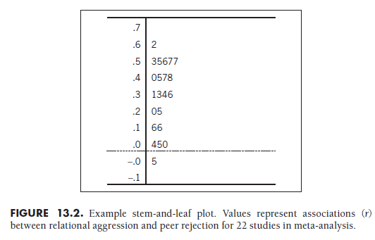These plots are commonly used and convey considerable information, including information about central tendency, variability, and distributional form (e.g., skewness, modality) of a set of effect size, as well as pointing to potential outlier studies with extreme effect sizes. Stem-and-leaf plots consist of two parts. The “stem” is the vertical array of “bins” of possible effect sizes (e.g., correlations between .70 and .79, between .60 and .69, etc.), and each “leaf” is a single-digit number representing the effect size from a single study. These effect sizes can be either in the original metric (e.g., r, o) or in a transformed metric (e.g., Zr, ln(o)); the original metric is more intuitive for readers, but the transformed metric is more useful for assessing potential skew in the distribution of effect sizes.5 Figure 13.2 presents a stem-and-leaf plot for the 22 studies in the example meta-analysis. The numbers to the left of the vertical line comprise the stem, scaled in intervals of .1 with a range one value higher and one value lower than the most extreme effect sizes found among these 22 studies. To the right of the vertical line are the leaves, with each digit representing a single study. For example, the highest leaf is the value 2 connected to the stem at .6 to represent a study that found a correlation of .62 between relational aggression and peer rejection. The five digits (leaves) connected to the .5 stem denote five studies finding associations between .50 and .59 (specifically, .53, .55, .56, .57, and another .57; note that the leaves are arranged from lowest to highest values moving away from the stem).