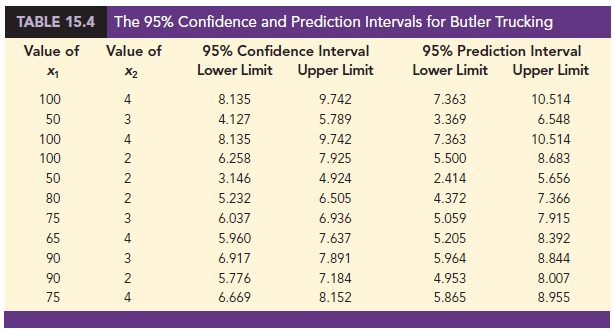 To develop interval estimates for the mean value of y and for an individual value of y, we use a procedure similar to that for regression analysis involving one independent variable. The formulas required are beyond the scope of the text, but statistical software for multiple regression analysis will often provide confidence intervals once the values of x1, x2, . . . , xp are specified by the user. In Table 15.4 we show the 95% confidence and prediction intervals for the Butler Trucking example for selected values of x1 and x2; these values were obtained with statistical software. Note that the interval estimate for an individual value of y is wider than the interval estimate for the expected value of y. This difference simply reflects the fact that for given values of x1 and x2 we can estimate the mean travel time for all trucks with more precision than we can predict the travel time for one specific truck.