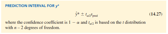 The 95% prediction interval for quarterly sales for the new Armand’s restaurant located near Talbot College can be found using ta/2 = t.025 = 2.306 and spred = 14.69. Thus, with y* = 110 and a margin of error of t.025spred = 2.306(14.69) = 33.875, the 95% prediction interval is