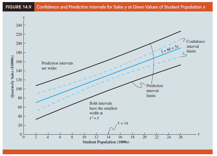 Confidence intervals and prediction intervals are both more precise when the value of the independent variable x* is closer to x. The general shapes of confidence intervals and the wider prediction intervals are shown together in Figure 14.9.