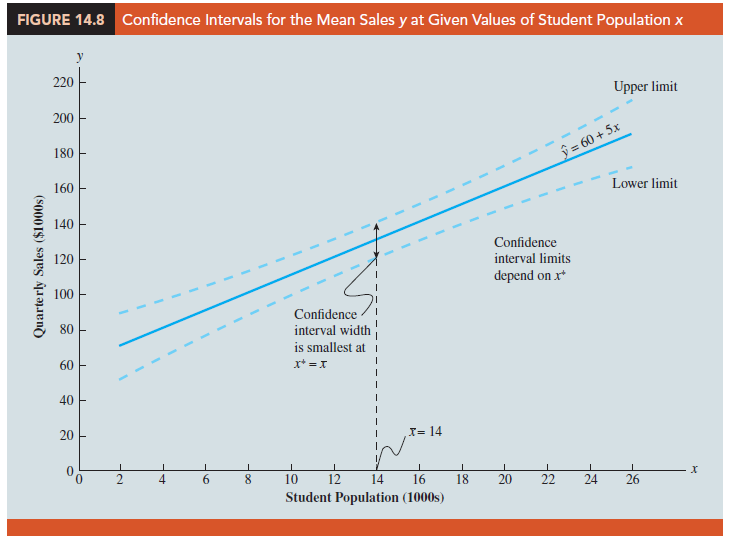 This result implies that we can make the best or most precise estimate of the mean value of y whenever x* = x. In fact, the further x* is from x, the larger x* – x becomes. As a result, the confidence interval for the mean value of y will become wider as x* deviates more from x. This pattern is shown graphically in Figure 14.8.
