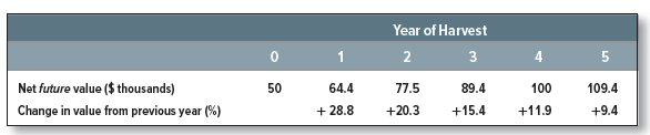 Notice that before year 4, the net future value of the timber increases by more than 10% a year: The gain in value is greater than the cost of the capital tied up in the project. After year 4, the gain in value is still positive but less than the required return. So delaying the harvest further just reduces shareholder wealth.