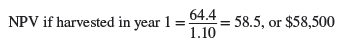 As you can see, the longer you defer cutting the timber, the more money you will make. However, your concern is with the date that maximizes the net present value of your investment, that is, its contribution to the value of your firm today. You therefore need to discount the net future value of the harvest back to the present. Suppose the appropriate discount rate is 10%. Then, if you harvest the timber in year 1, it has a net present value of $58,500:
