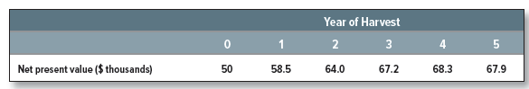 Let us suppose that the net present value of the harvest at different future dates is as follows: