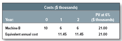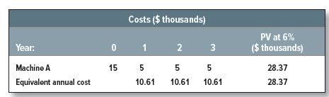 When the discount rate is 6%, the payment stream with such a present value turns out to be $10,610 a year. In other words, the cost of buying and operating machine A over its three-year life is equivalent to an annual charge of $10,610 a year for three years.