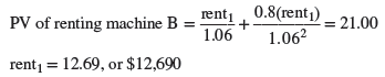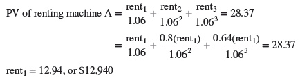 If the real rent for year 1 is rentj, then the real rent for year 2 is rent2 = 0.8 X rentj. Rent3 is 0.8 X rent2, or 0.64 X rentj. The owner of each machine must set the real rents sufficiently high to recover the present value of the costs. If the real cost of capital is 6%: