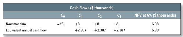 In other words, the cash flows of the new machine are equivalent to an annuity of $2,387 per year. So we can equally well ask at what point we would want to replace our old machine with a new one producing $2,387 a year. When the question is put this way, the answer is obvious. As long as your old machine can generate a cash flow of $4,000 a year, who wants to put in its place a new one that generates only $2,387 a year?
