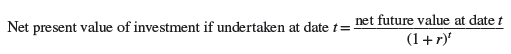 The fact that a project has a positive NPV does not mean that it is best undertaken now. It might be even more valuable if undertaken in the future. The question of optimal timing is not difficult when the cash flows are certain. You must first examine alternative start dates (t) for the investment and calculate the net future value at each of these dates. Then, to find which of the alternatives would add most to the firm’s current value, you must discount these net future values back to the present: