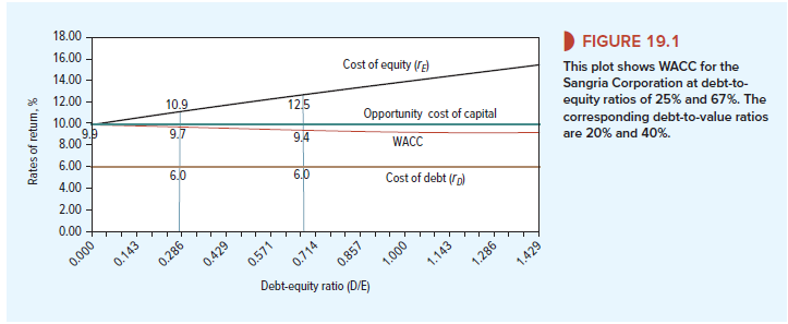 Figure 19.1 enters these numbers on the plot of WACC versus the debt-equity ratio.