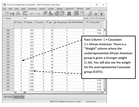Weightings that are greater than 1 mean that those respondents are given more weight or importance in the analysis.Weightings less than 1 mean that the respondents’ scores are given less emphasis in the analysis. After finding the weighting for each race, you need to form a new column in your SPSS data, and you can call it “weight”. For all the respondents, who are classified as a “1” in Race, you will include a weight of 0.875. For all respondents with a 2 in the Race field, you will include a weight of 1.50. See Figure 10.1.