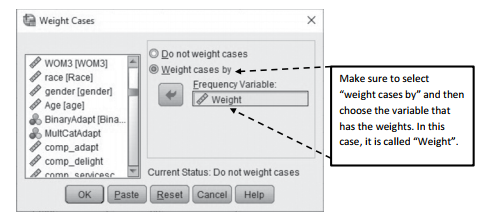 Please note that SPSS will continue to run subsequent analyses with the weighted scores until you tell SPSS to stop weighting the scores. To turn off the weightings, just go back into the “Weight Cases” pop-up menu, select “Do not weight cases”, and hit OK.