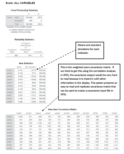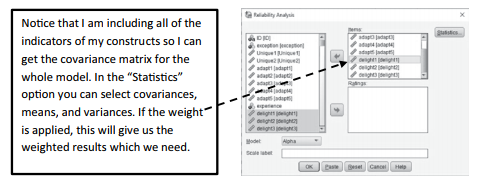 Let’s go back to the SPSS file where our data is located. To work around this problem, we are going to get the covariance matrix of the weighted scores. We will also get the weighted means and standard deviations for each indicator or construct. Once we get this information,