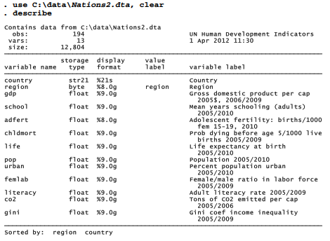 In some instances, weighting involves something simpler — an aggregate dataset in which the variables are statistics summarizing many individual observations. For example, dataset Nations2.dta contains United Nations human-development indicators that characterize living conditions in 194 nations.