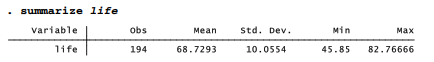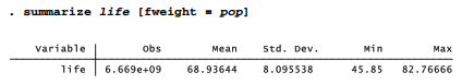 The mean above represents the average life expectancy for the 194 nations in the sample, rather than the average life expectancy for the 7 billion people who live in those nations. That is, it weights the life expectancy of the smallest nation (Tuvalu, a Pacific island nation with about 10,000 people) the same as the life expectancy of the largest (China, population about 1.3 billion). Using population as a frequency weight, we get a better estimate of the mean life expectancy for all 7 billion people.