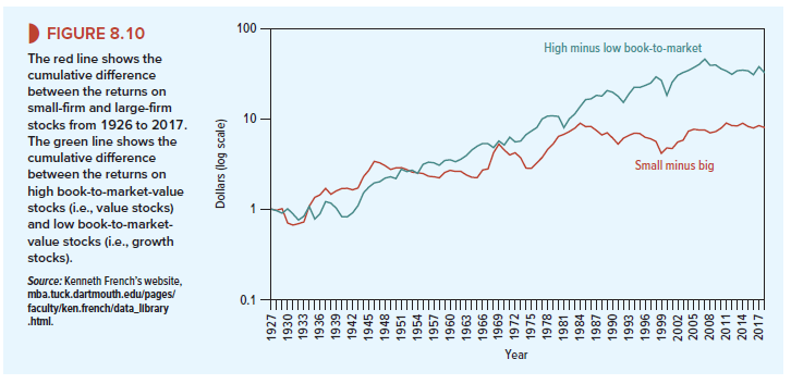 Now look at the green line in Figure 8.10, which shows the cumulative difference between the returns on value stocks and growth stocks. Value stocks here are defined as those with high ratios of book value to market value. Growth stocks are those with low ratios of book to market. Notice that value stocks have provided a higher long-run return than growth stocks.[6] Since 1926, the average annual difference between the returns on value and growth stocks has been 4.9%.