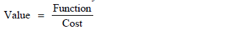 Value is not inherent in a product, it is a relative term, and value can change with time and place. It can be measured only by comparison with other products which perform the same function. Value is the relationship between what someone wants and what he is willing to pay for it. In fact, the heart of value analysis technique is the functional approach. It relates to cost of function whereas others relate cost to product. It is denoted by the ratio between function and cost.
