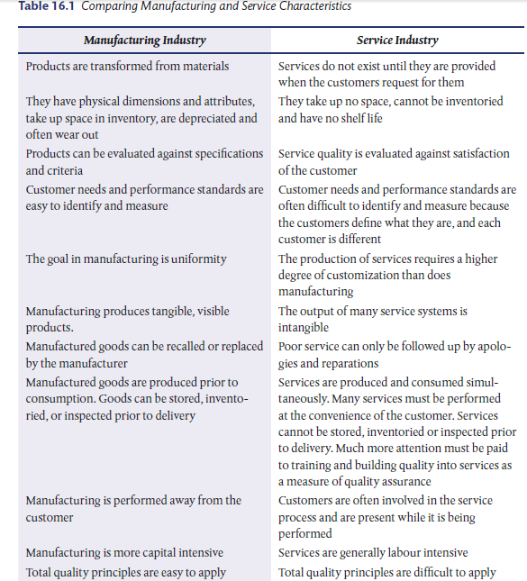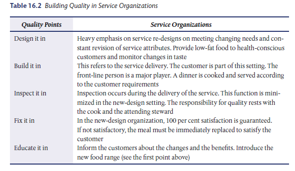 Table 16.2 lists the five ways in which an organization such as a restaurant can incorporate quality into its service. Strategic resource allocation in the organization determined to meet/exceed customer needs will enable a careful design and flawless delivery of the service. Such a strategy limits, if not eliminates the need for resource allocation for inspection and fixing activities.