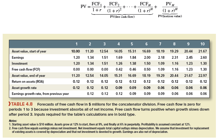 Table 4.8 gives a forecast of free cash flow (FCF) for the concatenator business. Free cash flow is the amount of cash that a firm can pay out to investors after paying for all investments necessary for growth. As we will see, free cash flow can be negative for rapidly growing businesses.