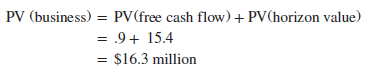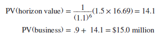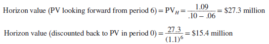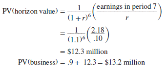 Therefore, we can calculate the horizon value at period 6 as the present value of a level stream of earnings starting in period 7 and continuing indefinitely. The resulting value for the concatenator business is: