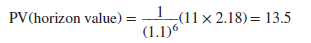 Therefore, we can calculate the horizon value at period 6 as the present value of a level stream of earnings starting in period 7 and continuing indefinitely. The resulting value for the concatenator business is: