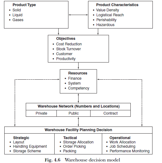 The warehouse decision model helps in identifying the strategic, tactical and operational needs of a warehouse system to fit into the overall objectives of a supply chain (see Figure 4.6).