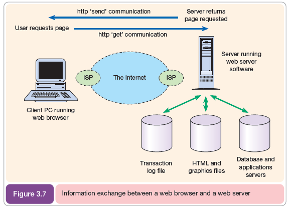 Figure 3.7 indicates the process by which web browsers communicate with web servers. A request from the client PC is executed when the user types in a web address, clicks on a hyperlink or fills in an online form such as a search. This request is then sent to the ISP and routed across the Internet to the destination server using the mechanism described in the section on protocols in networking standards, below. The server then returns the requested web page if it is a static (fixed) web page, or, if it requires reference to a database, such as a request for product information, it will pass the query on to a database server and will then return this to the customer as a dynamically created web page.