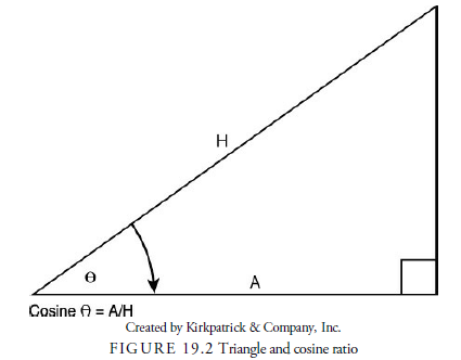In mathematical terms, the cosine (and sine) function describes a cycle. Figure 19.2 shows a right-angle triangle (one with a 90-degree angle). The side across from the 90-degree angle is the hypotenuse, labeled (H). A cosine of an angle is the ratio of the adjacent side to the hypotenuse. For example, in Figure 19.2, the cosine for angle U is A/H. Thus, for every angle, there is a specific cosine value.