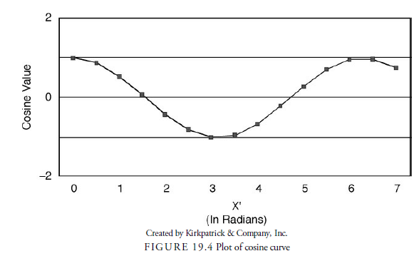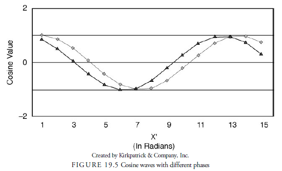 horizontal axis to an intersection perpendicular to the perimeter point, we can calculate the cosine of the angle between each hypotenuse and the axis line for each point along the perimeter. The cosine value is the ratio of the length along the x-axis (X’) divided by the radius of the circle. The cosine value will always be one or less because X can never be larger than the radius. As the point works its way around the circle counterclockwise, we can plot the series of cosine values in another chart with the angle (in radians) along the x-axis and the cosine value along the y-axis, as shown in Figure 19.4. As you can see in the figure, this results in a curve with values oscillating between -1 and 1. This curve is known as a cosine wave and is the basis for calculating the existence of cycles or waves in time series data.