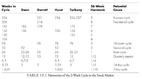 Notice that several of the cycles appearing in Table 19.1 are stock market cycles we have mentioned in previous chapters. The well-known presidential cycle is very dependable, as is the seasonal cycle. They are both multiples of the 26-week base cycle—the seasonal cycle by two, and the presidential cycle by eight (or 2 x 2 x 2). Thus, the Hurst hypothesis that cycles tend to occur in multiples of two or three seems to make sense.