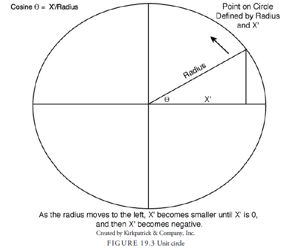 horizontal axis to an intersection perpendicular to the perimeter point, we can calculate the cosine of the angle between each hypotenuse and the axis line for each point along the perimeter. The cosine value is the ratio of the length along the x-axis (X’) divided by the radius of the circle. The cosine value will always be one or less because X can never be larger than the radius. As the point works its way around the circle counterclockwise, we can plot the series of cosine values in another chart with the angle (in radians) along the x-axis and the cosine value along the y-axis, as shown in Figure 19.4. As you can see in the figure, this results in a curve with values oscillating between -1 and 1. This curve is known as a cosine wave and is the basis for calculating the existence of cycles or waves in time series data.