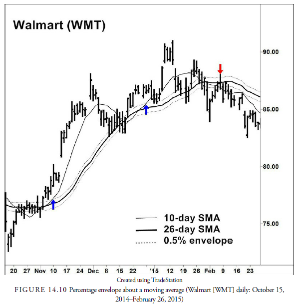 One way of creating this type of band is to use percentage envelopes. This method, also known as a percentage filter, was developed in an attempt to reduce the numerous unprofitable signals from crossing a moving average when the trend is sideways. This is a popular method used in most of the academic studies on moving average crossover systems. It is calculated by taking a percentage of the moving average and plotting it above and below the moving average (see Figure 14.10)—thus the term envelope. This plot creates two symmetrical lines: one above and one below the moving average.