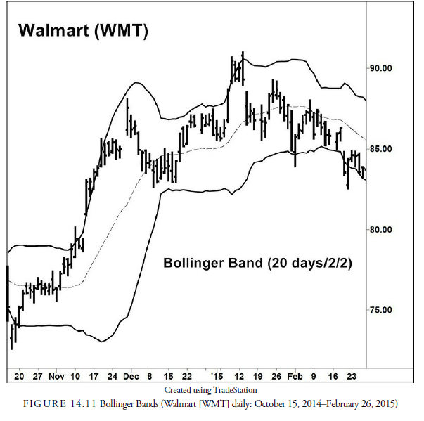 Figure 14.11 shows the standard Bollinger Band around the 20-period moving average with bands at two standard deviations. Of course, both the length of the moving average and the number of standard deviations can be adjusted. Theoretically, the plus or minus two standard deviations should account for approximately 95% of all the price action about the moving average. In fact, this is not quite true because price action is nonstationary and nonrandom and, thus, does not follow the statistical properties of the standard deviation calculation precisely. However, it is a good estimate of the majority of price action. Indeed, as the chart shows, the price action seems to oscillate between the bands quite regularly. This action is similar to the action in a congestion area or rectangle pattern (see Chapter 15, “Bar Chart Patterns”), except that prices also tend to oscillate within the band as the price trends upward and downward. This is because the moving average is replicating the trend of the prices and adjusting for them while the band is describing their normal upper and lower limits around the trend as price volatility changes.